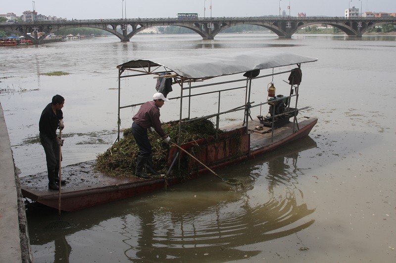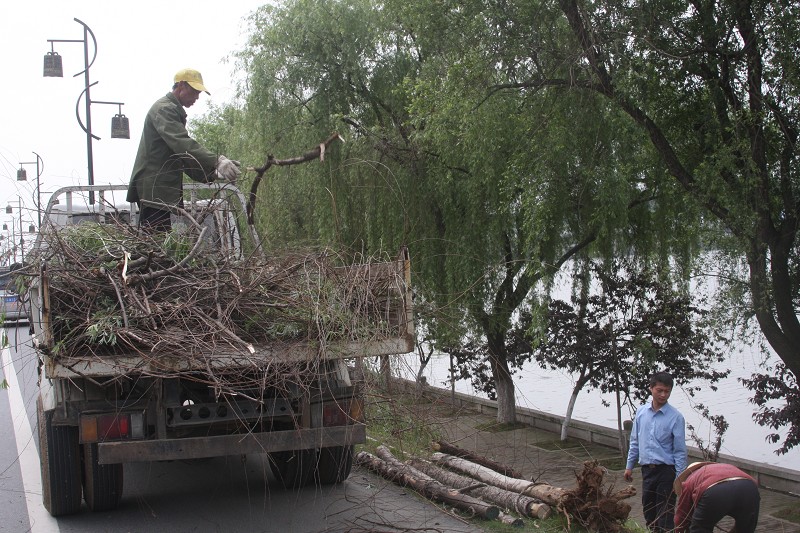 5月18日,白云湖水利管理局组织专班人员,为白云湖“洗脸美容”,确保水面干净(下图)。园林部门工作人员在白云湖堤旁为树木进行“梳妆”打扮(右图)。(本报记者 杨闻名 通讯员 王新摄)