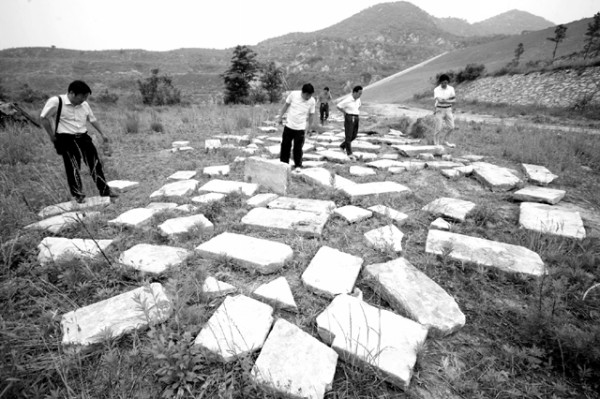 一大批清代古碑日前在随县万和花鹿沟水库被发掘出土(上图)。这批古碑分别为记事碑、古寨碑和墓碑,时间跨越清代乾隆、嘉庆、道光、咸丰、同治、光绪、宣统各个时期,目前已发掘近千块。这批墓碑的材质大多为青石碑,也有少量的汉白玉墓碑。花鹿沟水库负责人高源介绍说,这批古碑是1975年修建花鹿沟水库时作护坡基石用的,随州市收藏家协会会长沈志兵说,这些墓碑中,有一块是生于乾隆57年的太学生杨华泰的墓碑,这些古碑对研究当时的社会文化具有丰富的史料价值。右图:年代最早的乾隆32年的古碑。 (本报记者 孙洪涛摄)
