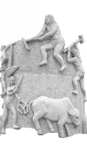 一天,炎帝神农躺在田垅上苦苦琢磨如何改进耕作技术,想入了迷,下大雨都没感觉到。后来,大概是为自己始终未想出个门道来而生气,他将一只手猛地戳进地里,又使劲向前一推。当他从泥中提起手,五条泥沟清晰地呈现在眼前,尤其是中指犁出的那条沟,又深又直,两旁翻起的土也很整齐。他喜出望外:若能仿照手指向前、手臂悬空的样子做成一种农具耕田,岂不又省力、又利于作物生长吗?他当即叫来伙伴们,先把一截质地坚硬的木头削成一个前薄后厚、前尖后宽的三角形,再在三角形后部装上一柄木把,又找来两根山藤穿在木把的底部。他让伙伴们在前面拉,自己扶着木把掌握方向和深浅。