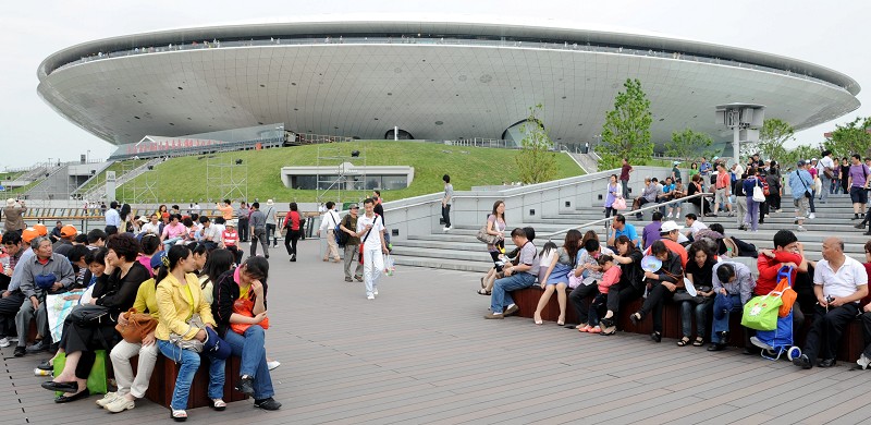 5月29日,游客在世博园文化中心广场参观。连日来,上海世博会的参观人数屡创新高,截至29日20时,当日入园人数达50.04万人,创开园以来单日客流量最高峰。 新华社发