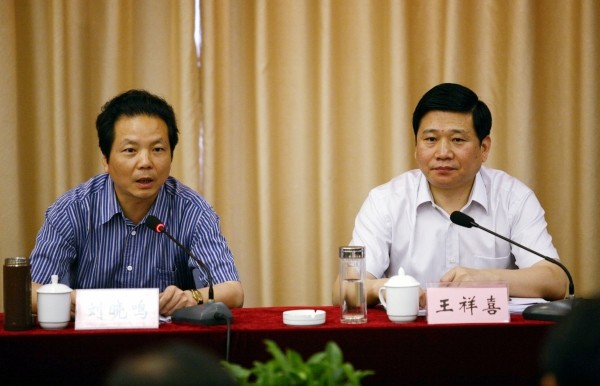 图为:市委书记王祥喜(右)在2010年世界华人炎帝故里寻根节筹委会全体会议上作重要讲话。市委副书记、市长刘晓鸣(左)主持会议。 (本报记者 孙洪涛摄)