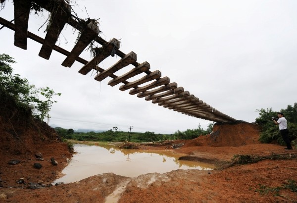 6月1日,广西来宾市来宾至合山铁路桥巩乡路段,一段铁路路基被冲毁。因持续暴雨淹没轨道,湘桂、焦柳、黔桂三铁路干线行车受到严重影响。 (新华社发)