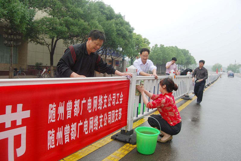 为迎接2010年世界华人炎帝故里寻根节,曾都广电网络支公司工会、共青团组织开展“万人洁美随州城,网络服务寻根节”主题活动。五月十八日上午,八十余名干部员工走上街头,自购卫生洁具对沿河大道、解放路东段近五公里交通护栏进行清洁。(任尚海 摄)