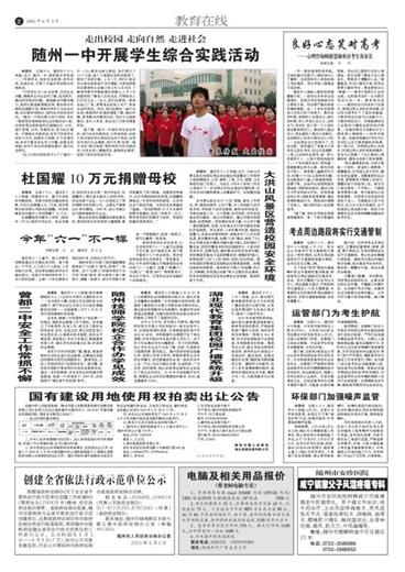 图为:随州一中学生整装待发,走出校园。 本报讯 记者张顺、通讯员叶银品报道:近日,随州一中、欧阳修中学的高一、二年级学生,纷纷走出校园,走向自然,走进社会,开展了丰富多彩的综合