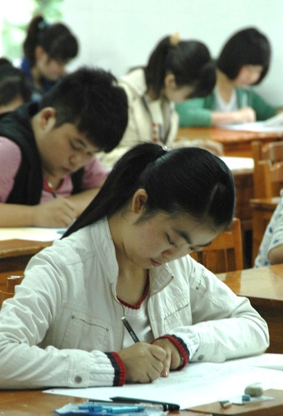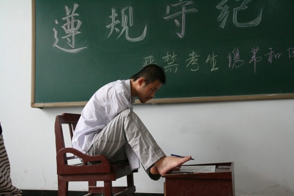图⑤:在河北省邯郸市磁县第一中学第67考场,无臂考生索鹏飞用脚答出了高考试卷。 (新华社发)