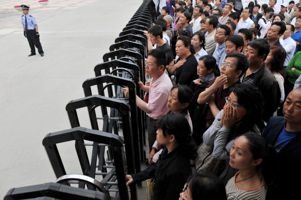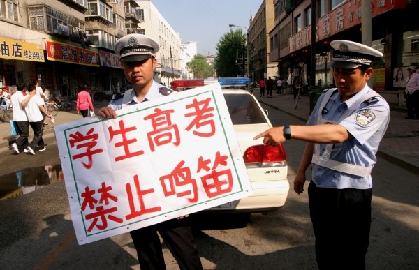 图④:南京市第一中学的几名学生在本校考点大门旁举着标语牌为考生们加油、祝福。