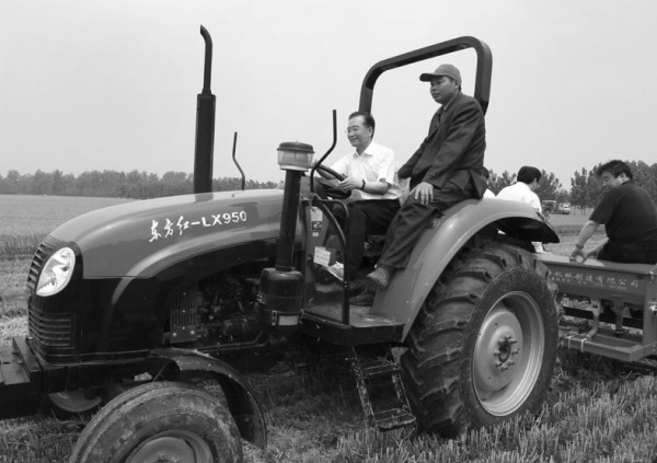 6月9日至10日,中共中央政治局常委、国务院总理温家宝在河南考察“三夏”工作。在河南省许昌县陈曹乡后孙汪村高产小麦示范区,温家宝登上一台“东方红”牌拖拉机的驾驶室,在司机的指导下挂挡、加油,紧握方向盘,稳稳地驾驶着,在刚刚收割的麦地里深耕、施肥,种下秋玉米。
