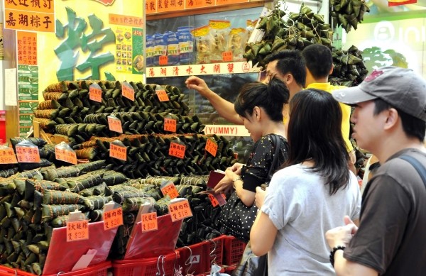 右下图:6月14日,香港市民在选购粽子。端午节将至,香港许多店铺推出各式粽子,让市民选购。 (新华社发)