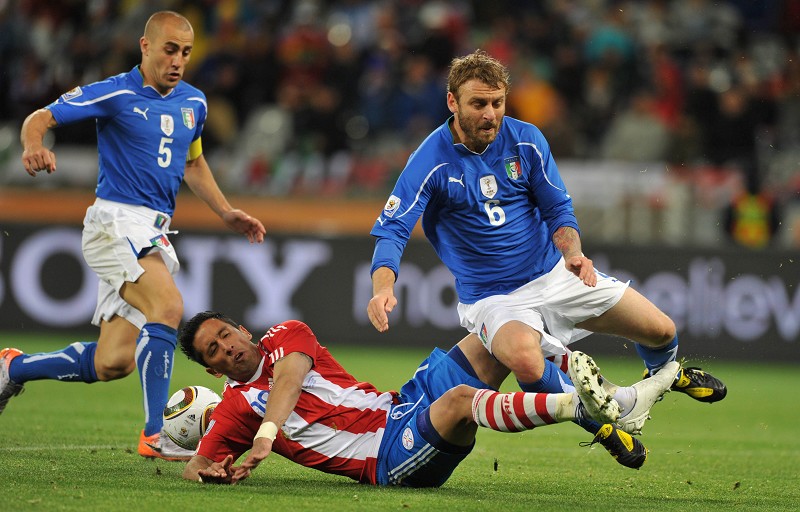 6月14日,意大利队球员德罗西(右)与巴拉圭队球员巴里奥斯拼抢。