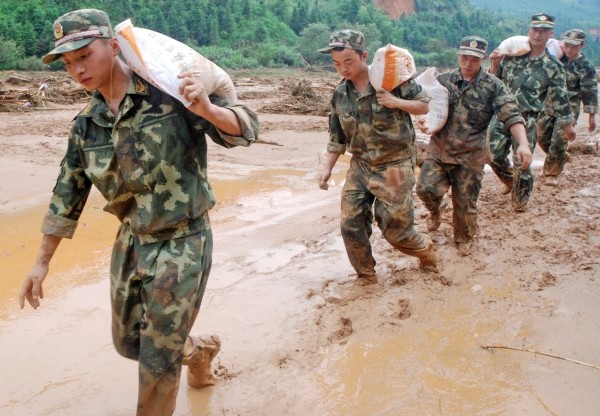 6月18日以来,地处闽北的顺昌县遭受特大暴雨袭击,泥石流等地质灾害频发,洋口镇田坪村有近200名村民因道路被毁无法向外转移,面临断水断粮的困境。武警福建省总队直属支队闻讯后迅速组织200名官兵,在泥泞中跋涉,将3500斤“救命粮”和3000多米引水管送到受灾群众手中。 (新华社发)