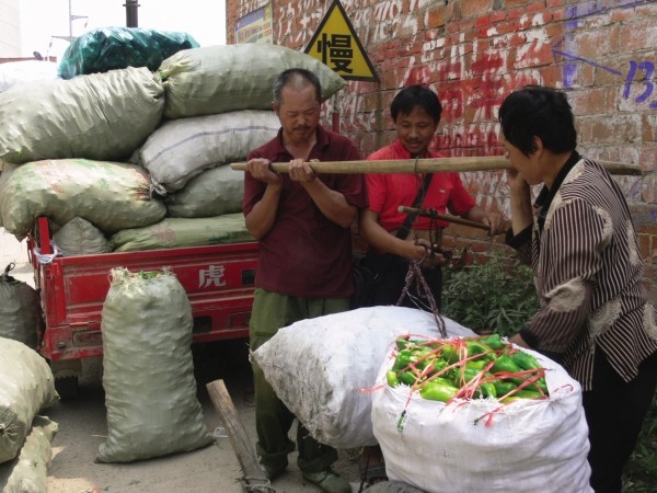 随州经济开发区淅河镇东门口居委会是一个蔬菜种植村,该村依靠科技种植各类蔬菜、瓜果,让村民走上了致富路。在蔬菜经纪人精心组织下,该村蔬菜远销上海、北京等地,蔬菜价格可观,村民得实惠。图为该村三组菜农李秀兰正将自己种植的青椒卖给蔬菜经纪人。(王涛 摄)