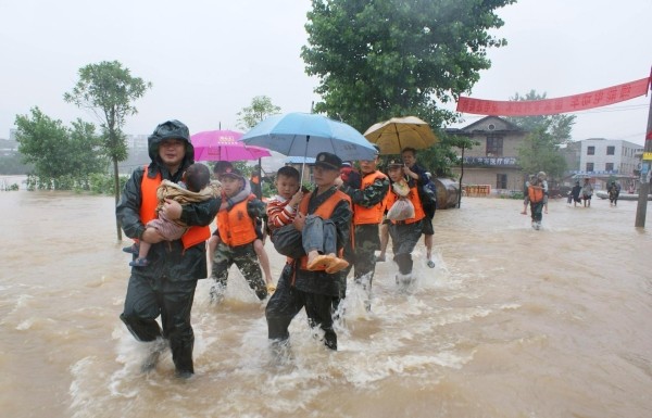 6月20日,在吉安市金滩镇白路村,武警官兵冒雨将孩子们先期往安全地带转移。受连日强降雨影响,江西中北部发生严重洪涝灾害,大批群众被洪水围困,驻地武警官兵正深入灾区开展抗洪抢险工作,转移被困群众。 (新华社发)