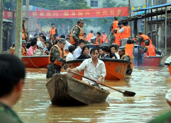 图为6月23日,在唱凯中学地段,武警官兵用冲锋舟转移群众。