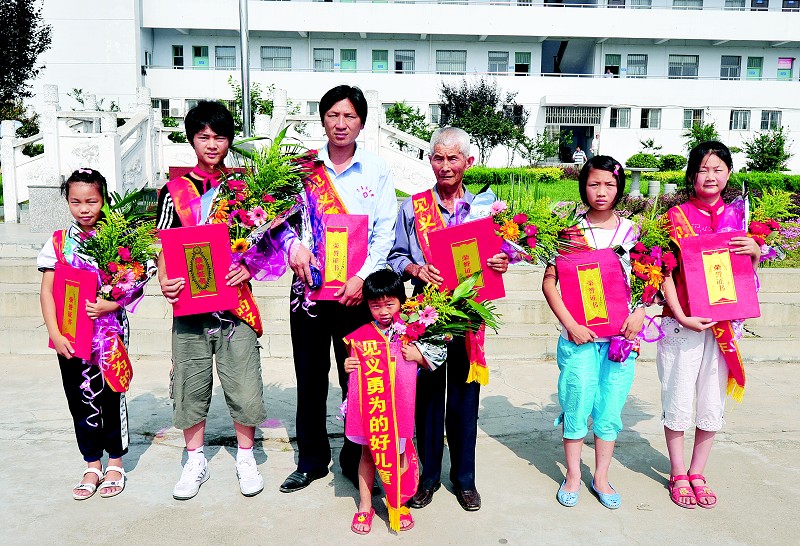 鲜红的绶带、美丽的鲜花、感动的群众,簇拥着7位舍己救人的先进人物:见义勇为好干部谌知敏、好党员严宏恩(78岁),好少年邹璇、董佳曼、万俊、邹品志,好儿童董紫宣(6岁)。
