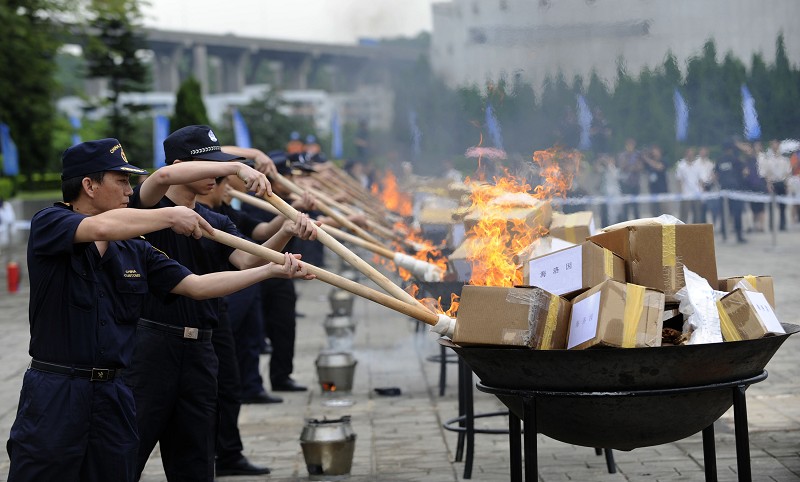 6月25日,工作人员在点燃焚化炉上的毒品。当日,在第24个国际禁毒日即将来临之际,海关总署在广东虎门海战博物馆举行走私毒品销毁仪式,销毁全国海关近年来查获的上吨走私毒品。 (新华社发)