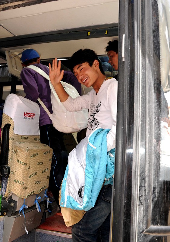 6月26日,一名即将前往四川就读的学生登上车,与父母挥手告别。当日,玉树藏族自治州民族中学478名学生率先踏上前往省外就读的旅程。据悉,首批1600多名玉树灾区学生将陆续启程赴四川省都江堰市转移就学。根据国家统一部署,玉树灾区将有5074名学生前往四川、山东、山西、辽宁、天津5省市的6所学校就读。 新华社发