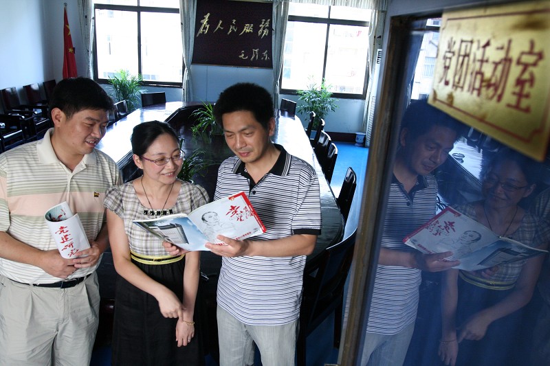 6月28日,广水市应山街道办事处党团活动室,几名党员在学习党建知识。据悉,“七一”临近,该办事处充分发挥党员干部在“争先创优”活动中作用,服务群众、凝聚人心,以展示党员先进性。 (本报记者 宋俊超 杨闻名摄)
