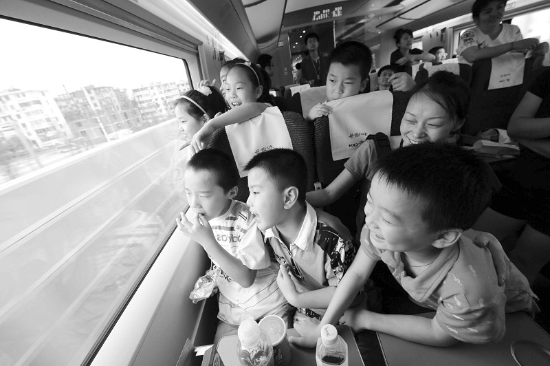 安徽马鞍山市师范附小的小学生乘坐G5001次动车组列车前往上海看世博会。·新华社发·