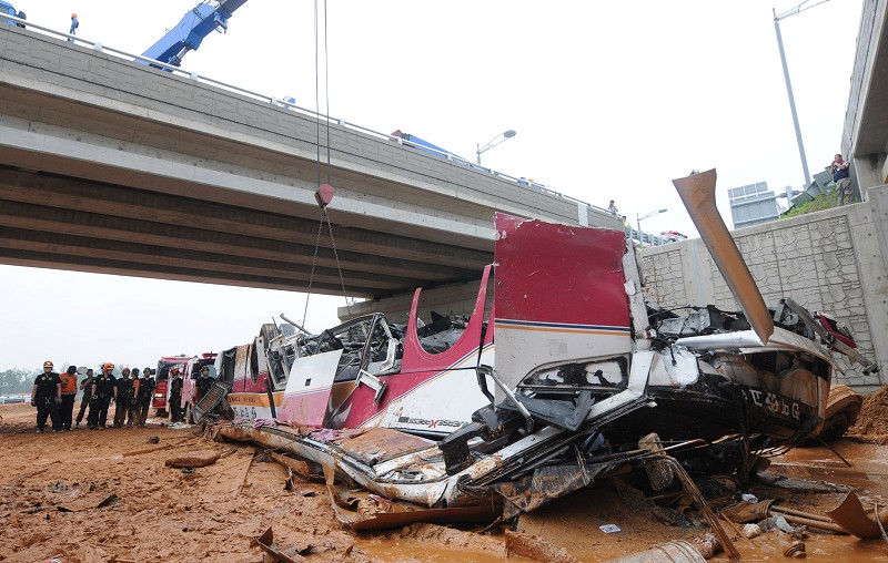 据救援人员统计,到目前为止,在包括司机在内的24人中,有12人死亡,另外12名不同程度伤者已被送往附近医院接受救治。图为救援人员准备吊起发生坠桥事故的巴士。 (新华社发)