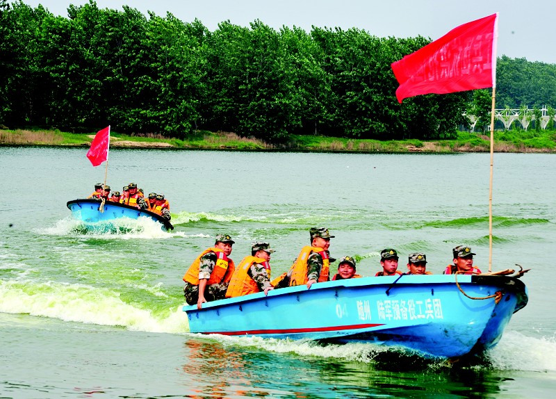 为了做好抗洪抢险救灾准备,连日来,驻随某预备役工兵团组织全体现役官兵顶着炎炎烈日,在白云湖水域进行抗洪抢险应急演练。官兵们进行了冲锋舟水上编队航行、水上救生、过障碍物、打捞漂浮物等课目的训练。(本报记者 李文军 摄 通讯员 许永强 文)
