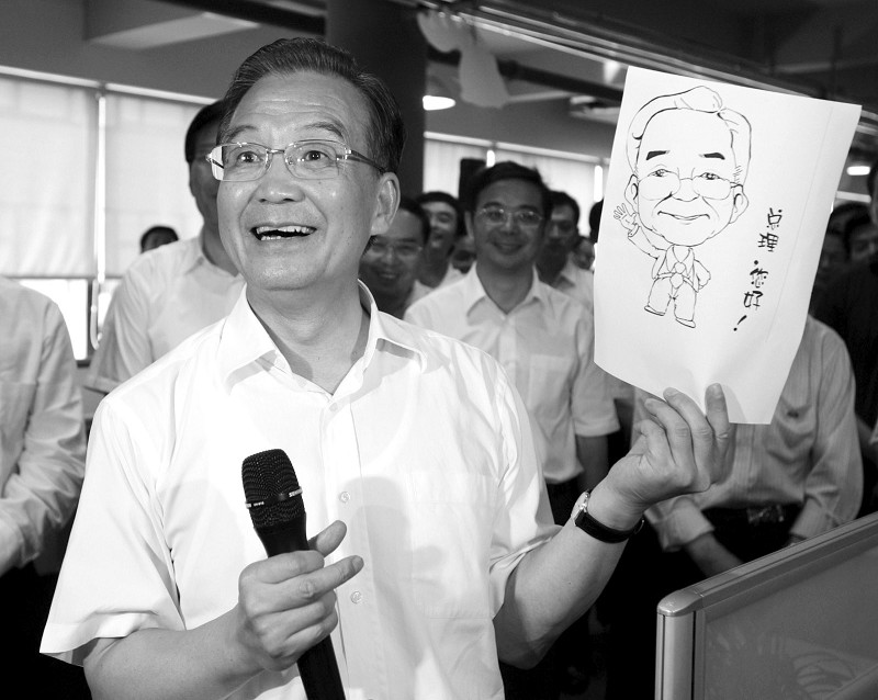 温家宝在长沙拓维信息系统公司考察时接受员工赠送的漫画像。 (新华社发)