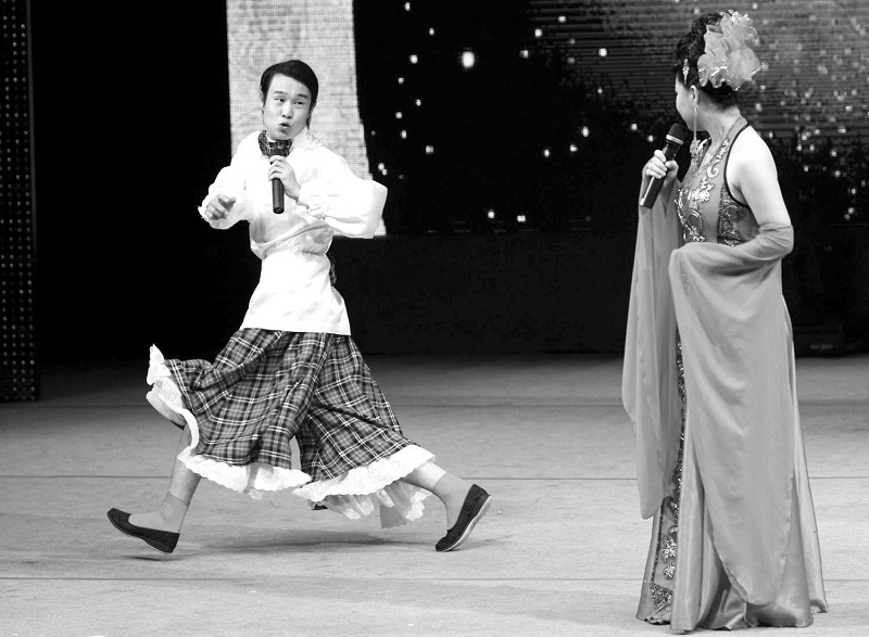 7月3日,小沈阳(左)和沈春阳在表演。当日,赵本山带领小沈阳、毛毛、王金龙等弟子将刘老根大舞台搬到了台北孙中山先生纪念馆,在近3个小时的演出中,现场上千名观众掌声不断,欢呼声此起彼伏。当晚演出的门票收入将全部捐赠给台湾慈善机构。 (新华社发)