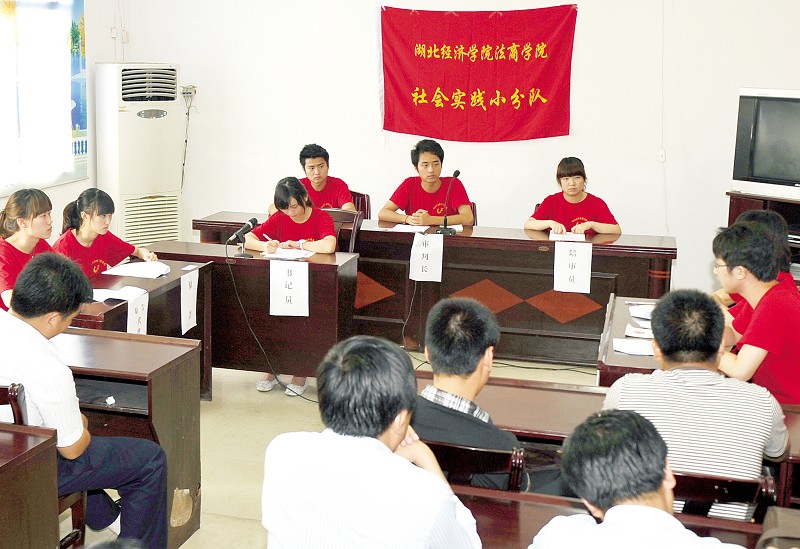 7月6日,一场模拟法庭活动在随州经济开发区湖北源丰化工公司内举行,吸引了众多企业职工参加旁听。原来,这是湖北经济学院法商学院法学系暑期社会实践小分队的一项活动。 (本报记者 李文军摄)