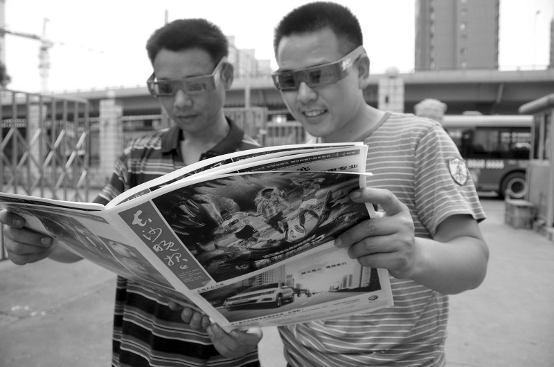 7月9日,两名读者在用随报赠送的3D红蓝眼镜阅读3D报纸。当日,《长沙晚报》推出湖南首份3D报纸。与观看3D电影一样,观看3D报纸要戴上一副特制的3D眼镜,透过眼镜,读者可以看到千变万化,栩栩如生的版面。(新华社发)