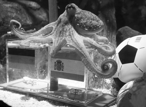 章鱼大仙又被称为“章鱼哥”,这只名为保罗生于英国长于德国的章鱼在南非世界杯期间的预测极其准确,这可比球王贝利的“乌鸦嘴”要可爱得多。在德国队晋级四强之前,章鱼大仙始终预测德国队是胜者,直至半决赛前它终于“叛逃”到西班牙队一边,结果德国队果真被淘汰。虽然有专业人士揭秘称保罗的预测来自于国旗的色彩感官刺激,但是作为一名与比赛并不相关的 “非人类”,章鱼大仙能有如此人气的确有些出乎意料。