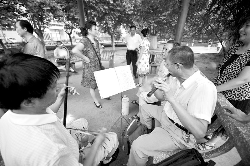 左图:爱好器乐和唱歌的市民,集中在神农公园一角,一边纳凉,一边展示自己的拿手绝技或歌喉。