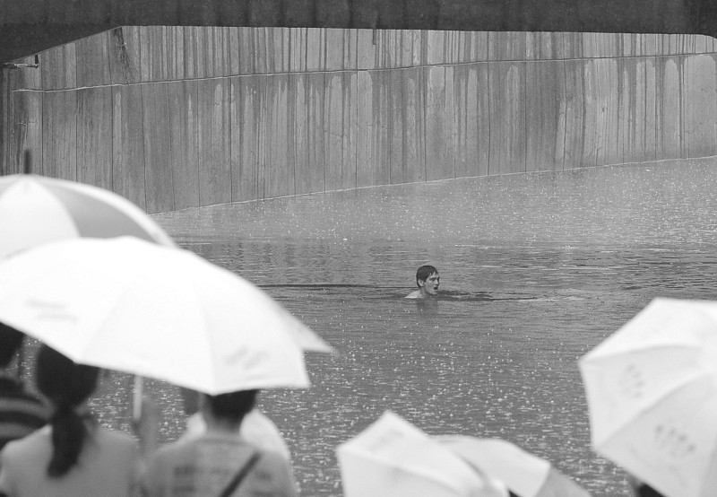 七月十一日,一名武汉市民在一处滞水深达两米的地下通道探摸丢失在水中的公文包。当日,武汉地区遭遇持续暴雨袭击,造成城区部分地段滞水严重,交通发生堵塞,给市民出行带来不便。(新华社发)