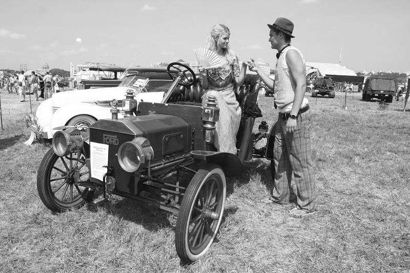 7月10日,在俄罗斯莫斯科郊外的图希诺机场,模特站在参展汽车旁。7月9日至11日,第14届莫斯科另类汽车展在这里举行。在车展上,人们将自己的汽车打扮得新奇怪异,吸引眼球。共有来自世界各地的7000多辆汽车参展。 (新华社发)