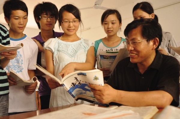 曾都二中学生周坤林 (左三),将与辅导教师叶全军(右),一起前往四川参加全国中学生作文竞赛颁奖大会。周坤林的作文 《校门》,在今年的第十一届“新世纪”杯全国中学生作文大赛中荣获一等奖。 (本报记者陈德友 通讯员 张红春摄)