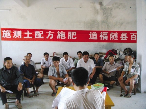 前段时间,我市各地遭遇不同程度的干旱和病虫灾害。随县组织农业技术人员深入田间地头,开展测土配方施肥、病虫调查。图为随县土肥站、植保站农业专家日前到尚市镇粮食高产创建示范区开展技术培训,送《随县土肥》、《随县病虫测报》等技术资料,并指导农户科学施肥和病虫防治。 (本报记者 采阳 通讯员 明芝摄)