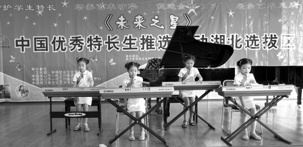 日前,由全国少工委、全国学联共同组织的“未来之星”中国优秀特长生推选活动湖北选拔赛在武汉音乐学院举行。我市瑞波音乐艺术教学基地选送的四名电子琴小选手获得本次活动的特等奖。 (本报记者 杨闻名摄)