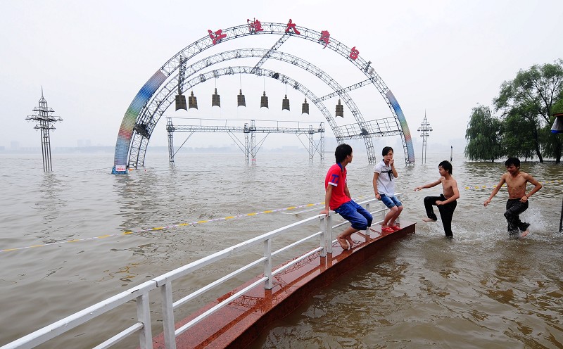 7月14日,几位市民在汉口江滩戏水,汉口江滩一处用于表演的亲水平台“江滩大舞台”已被淹没。随着湖北大部分地区降雨天气持续,造成长江中下游干流河段水位持续上涨,14日14时17分,长江汉口站水位达26.32米,超25米的设防水位1.32米。 (新华社发)
