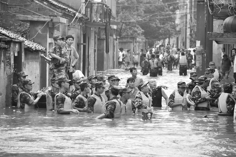 一夜暴雨,洪水冲进广水市区。7月17日,消防官兵在广水市应山城东大街解救和疏散被洪水围困的群众。 (本报记者 杨闻名 通讯员 李国刚摄)