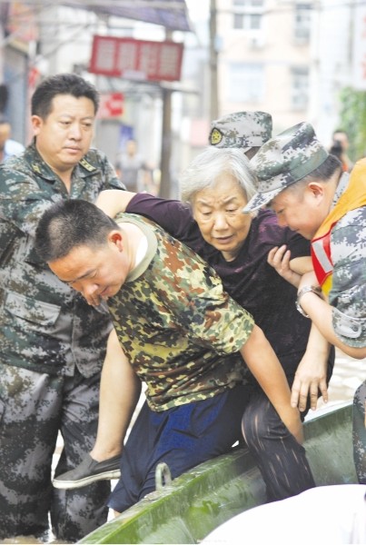 7月17日,陆军预备役随州工兵团在广水城区转移一位行动不便的老大娘。当天该团组织两艘冲锋舟投入广水抗洪抢险。 (本报记者 李文军摄)