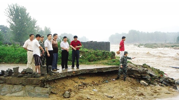 7月16日晚至17日晨,随县北部殷店等乡镇普降暴雨,水电通讯中断,道路被毁,县委副书记张健(左四)带领民政局干部指导救灾工作。