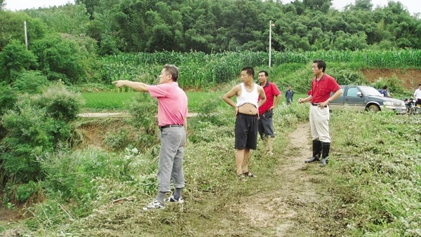 随县民政局局长雷震(右一)在殷店勘察灾情