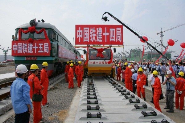 7月19日,随着铺轨机在徐州东站平稳地铺下一段500米长钢轨,标志着世界上一次建成线路最长、标准最高、新中国成立以来一次投资规模最大的高速铁路铺轨启动。全长1318公里的京沪高铁,总投资2200亿元。预计今年年底完成铺轨,2012年前建成通车。 (新华社发)