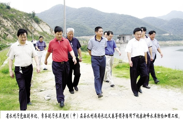▲省水利厅党组副书记、常务副厅长吴克刚(中)在县水利局局长沈义春等领导陪同下视察新峰水库除险加固工程。