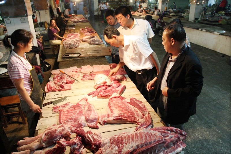 7月17日凌晨6点,记者跟随曾都区动物卫生监督所执法人员,对我市集贸市场销售猪肉的摊点进行检查。按照规定,只有能够出示相关检疫证明的摊贩才具备销售猪肉的资格(图6)。