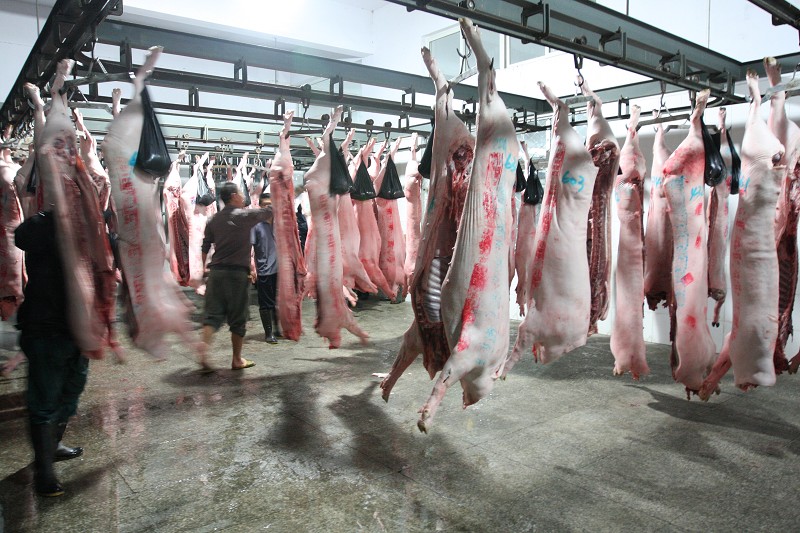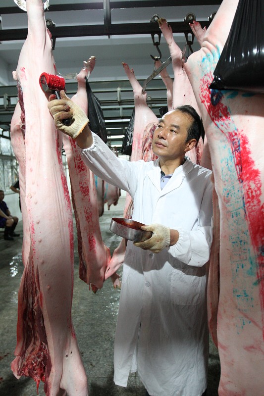生猪检疫是保障放心猪肉进入餐桌的重要环节。这些刚刚宰好洗净的生猪只有经过检疫合格之后,才能运送到市场。