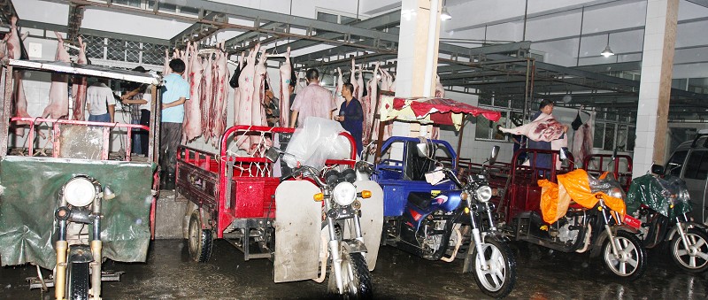 凌晨4点20分,通过专业仪器检测后,商贩们拿到“动物产品检疫合格证明”,把猪肉拉走(图4)。