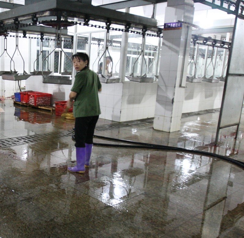 凌晨5点,宰好的生猪运出后,屠宰厂的工作人员对地面进行严格清洗(图5)。