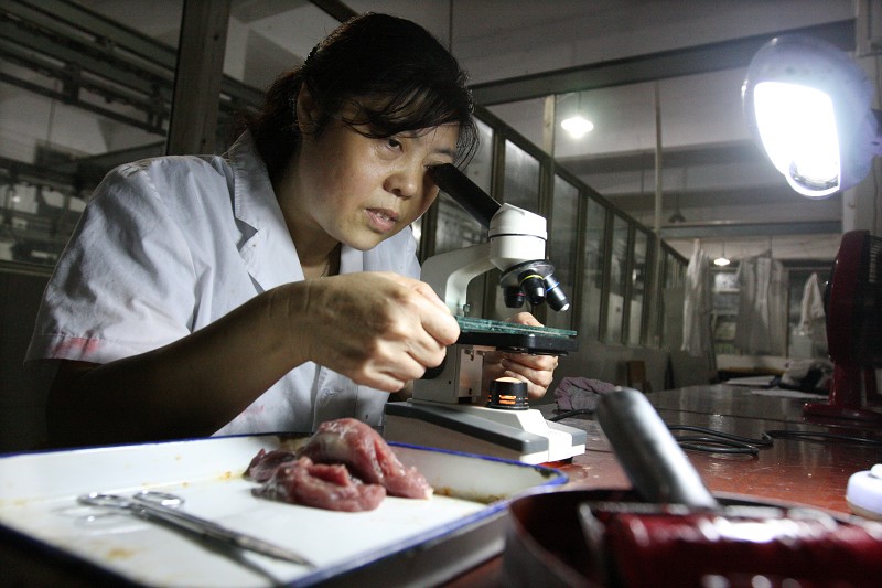凌晨3点20分,两名穿着白大褂的专门检验人员,从清洗干净的猪体上割下小块猪肉,带到专门的工作室里面,用专业的仪器进行检测(图2)。检测结果正常,方可在猪背上分别盖上检疫印章和肉品检验合格印章(图3)。