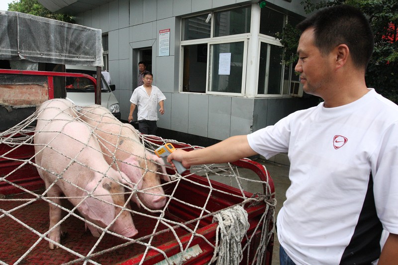 17日上午9点多钟,记者再次来到长信肉类加工厂。在加工厂的门口,每头生猪进场,区动物卫生监督所的工作人员都要对其进行体温检测,只有检测正常,才能进入屠宰场(图7)。