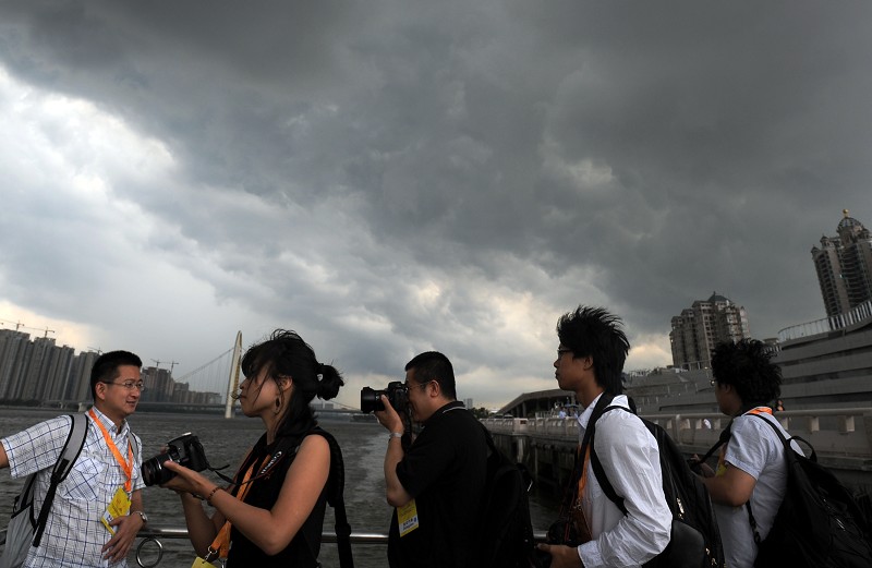 7月21日,记者在广州珠江边拍摄乌云密布的广州市区。今年第3号热带风暴“灿都”于21日凌晨加强为强热带风暴,逐渐向海南万宁到广东沿海靠近,有可能于22日凌晨到下午在这一带沿海登陆。为确保安全,经与徐闻海事处协商,琼州海峡于21日10时全线停航。 (新华社发)