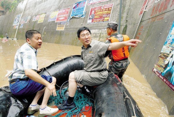 随州供电公司总经理吴国诚(左二)协调组织橡皮艇解救受困群众